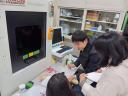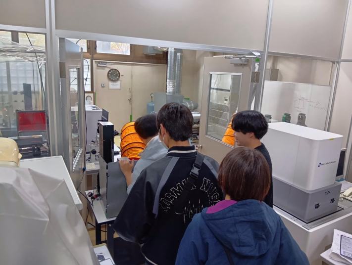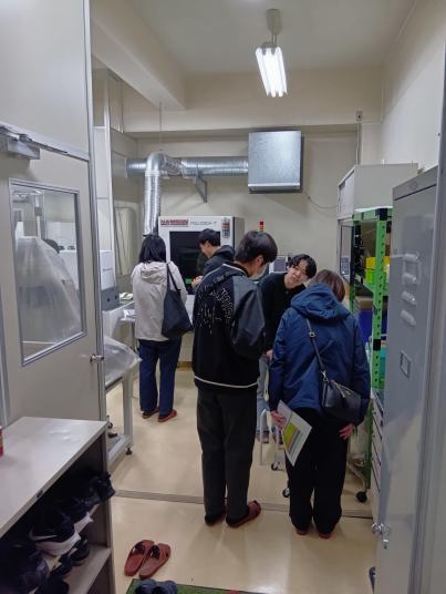 250名の見学者があった。(見学待ちの生徒に先端加工実験室前にて事前説明)